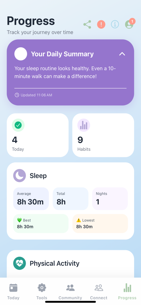 • Whole-Body habit tracking: Log daily routines that strengthen your body and mind — from movement and rest to mindfulness and reflection.